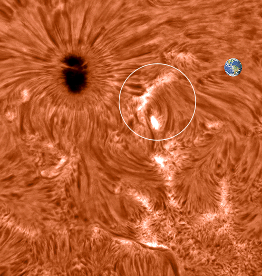 solar en medio de una llamarada, insertando una imagen de la Tierra a