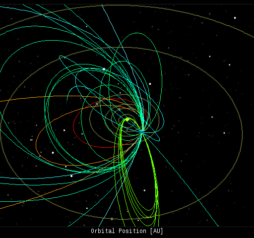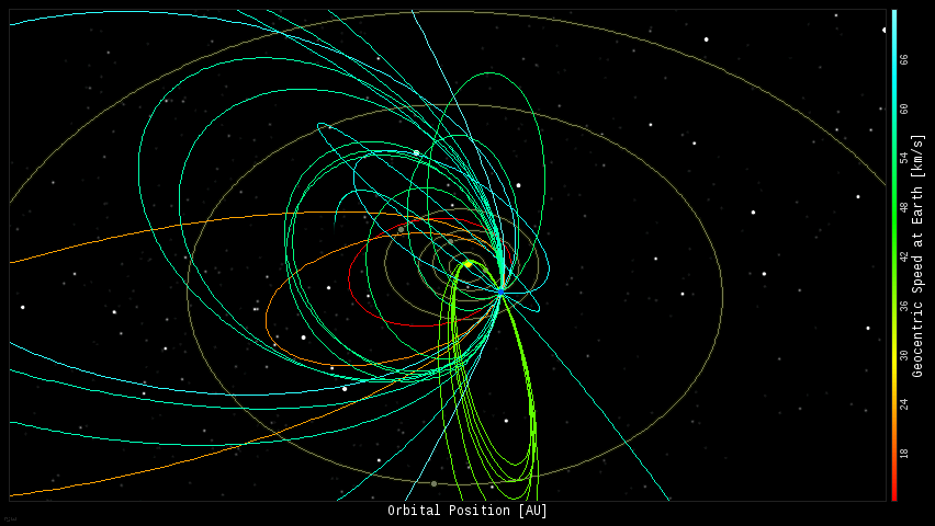 Las órbitas están codificadas por colores por velocidad, de lenta (roja) a rápida (azul).