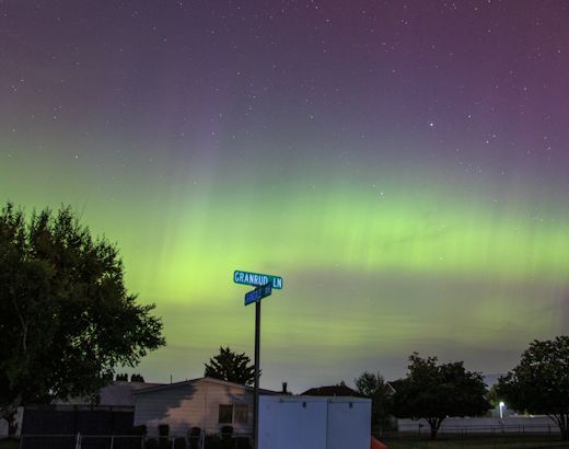 Philip Granrud envía este informe desde Montana: "La aurora boreal bailaba casi en lo alto de los límites de la ciudad de Kalispell hace solo unas horas".