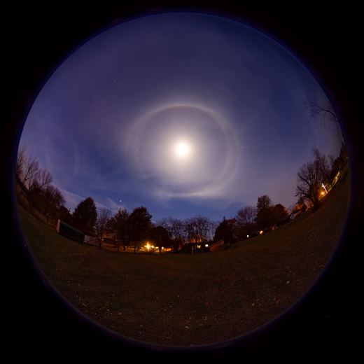 Los cristales de hielo en forma de lápiz que flotan en las nubes cirrus sobre Albany captaron los rayos de la brillante luz de la luna, doblándolos en dos formas concéntricas: (1) un halo circular de 22 grados y (2) un halo ovalado circunscrito.