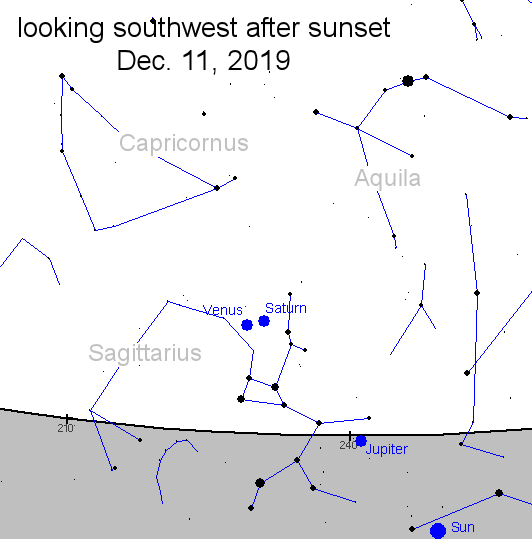 Venus brillante sale del crepúsculo primero, seguido ~ 15 minutos después por Saturno de primera magnitud.