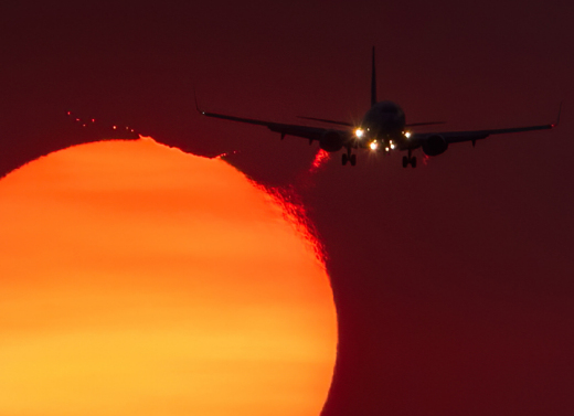Las irregularidades térmicas en el aire detrás del avión estiraron y distorsionaron el borde del sol, creando aparentes fuegos artificiales más grandes que cualquier llamarada solar real en 2020.
