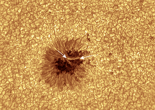 Un brillante cañón de luz, también conocido como "puente de luz", se abre en el núcleo primario de la mancha solar: