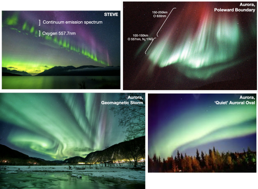 Arriba : El verde puro de las balas de cañón de STEVE (arriba a la izquierda) se compara con el verde azulado y otros colores mezclados de las auroras. Crédito: Joshua Semeter, Boston Univ.