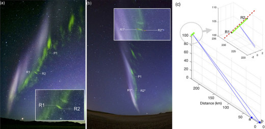 Arriba: Usando imágenes de aficionados, el equipo de Semeter trianguló la altura de las "balas de cañón de STEVE".